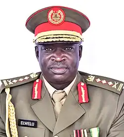 Peter Elwelu is a retired Lieutenant General in the Ugandan military, known formally as the Uganda People's Defence Force (UPDF). Since 24 June 2021, he has been the Deputy Chief of the Defense Forces of the UPDF.[2] He was appointed to that position on 24 June 2021.[3] Since 9 January 2017, he has served as the commander of the land forces, which is the third-highest position in the UPDF hierarchy.[4] From June 2013 until January 2017, he was the commander of the UPDF 2nd division, based in Mbarara, the largest town in Uganda's Western Region.[5] Elwelu is most known for the Kasese massacre in which, according to Human Rights Watch, 153 people were killed.[6]