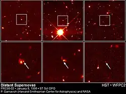 - ^ Garnavich, P. M.; Kirshner, R. P.; Challis, P.; Tonry, J.; Gilliland, R. L.; Smith, R. C.; Clocchiatti, A.; Diercks, A.; Filippenko, A. V.; Hamuy, M.; Hogan, C. J.; Leibundgut, B.; Phillips, M. M.; Reiss, D.; Riess, A. G. (1998-02-01). "Constraints on Cosmological Models from Hubble Space Telescope Observations of High-z Supernovae". The Astrophysical Journal. 493 (2): L53 – L57. arXiv:astro-ph/9710123. Bibcode:1998ApJ...493L..53G. doi:10.1086/311140.