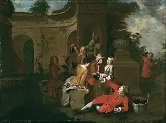 His works provide an interesting record of everyday life in Munich in a light hearted Rococo style.[2] In particular, he left a chronicle of life at the Bavarian court and of the local aristocracy through his numerous portraits and genre pieces. He documented court concerts, carousel races, hunting parties, outdoor dinner parties and lovers' trysts.[7] His elegant scenes are often set on a terrace of an imposing building in classical style and decorated with sculptures. These sculptures were painted after plaster studio models of the artist which re-appear in many of his paintings. The terrace serves as a stage for the action depicted in the picture.[8] Many of these works can be regarded as conversation pieces and call to mind the fête galantes of French Rococo artists such as Antoine Watteau. He made many individual portraits of the members of the court as well as of other artists such as painters, sculptors and musicians. For the Amalienburg he painted more than 200 portraits.[9]