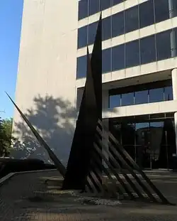 Massachusetts native and artist John Raimondi’s sculpture, Peter John, is an abstract piece that consists of three triangular forms located in Milwaukee’s downtown. The three triangular forms meet at a central point near the base of the sculpture and jut out from one another as the sculpture is viewed from bottom to top. The sculpture was commissioned in tribute to John Raimondi’s father. A Blue Cross Blue Shield customer, John Whipperfield, commissioned the project from a donation. The total cost of the project was $200,000. This donation led to the groundbreaking of the project in 1978.[1] The plaque on site reads: PETER JOHN/Cor-Ten steel/John Raimondi, Sculptor/Bequest from John Whipperfield/Subscriber to Blue Cross of Wisconsin/and Surgical Care - Blue Shield/June 1978.[1]