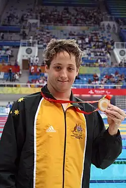 At the 2008 Beijing Games in his Paralympic debut, he won three gold medals in the Men's 100 m Butterfly S8, Men's 200 m Individual Medley SM8, and Men's 4 × 100 m Medley 34 pts events, for which he received a Medal of the Order of Australia,[1] four silver medals in the Men's 50 m Freestyle S8, Men's 4 × 100 m Freestyle 34 pts, Men's 400 m Freestyle S8, and Men's 100 m Backstroke S8 events, and a bronze medal in the Men's 100 m Freestyle S8 event.[5] He broke four world records and four Paralympic records.[2]