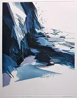 Landscape has always dominated his work. Early inspiration came from the quarries of Wales and the idea of figures in an empty pared-down landscape. In 1971, he established a studio on the north coast of Scotland. There were no more figures, only the rocks, heather, rivers, cliffs and sea of Caithness and Sutherland. He used several plates for each etching and a wide colour palette[11][12] a