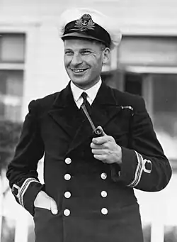 On the outbreak of the Second World War, Phipps was called up for military service and posted to the Navy Office in Wellington, where he served as an intelligence officer. In May 1940, he was seconded to the Royal Navy and traveled to the United Kingdom where he was given his first command.[1] This was the anti-submarine trawler HMS Bay, part of the 24th Minesweeping/Anti-Submarine Flotilla, which operated on convoy duties in the English Channel. On his first trip in Bay, it was struck by two bombs which failed to explode. In July 1941, he was promoted to lieutenant commander. He performed competently as the captain of Bay and was recommended for higher command. He had earlier been awarded the Distinguished Service Cross (DSC) for "For courage and devotion to duty in Channel Convoys".[3][4]