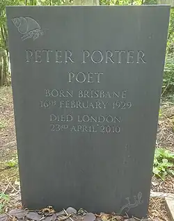 Porter died on 23 April 2010, aged 81, after suffering from liver cancer for a year.[6] After news of Porter's death in 2010, the Australian Book Review (ABR) announced that, in his honour, it would rename its ABR Poetry Prize as the Peter Porter Poetry Prize.[7] He was buried on the eastern side of Highgate Cemetery.