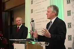 In January 2010, following a scandal involving his wife Iris, Robinson temporarily handed over his duties as First Minister to Arlene Foster under the terms of the Northern Ireland Act 2006.[3] Following a police investigation, which recommended that Robinson should not be prosecuted following allegations made by the BBC in relation to the scandal, he resumed his duties as First Minister.[4][5] The Official Assembly Commissioner's Investigation and Report cleared Robinson of any wrongdoing.