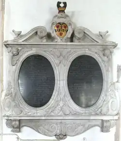 His "very neat and tasteful"[24] mural monument, erected in 1679 by his son Samuel, survives in St Disen's Church, Bradninch, on the north wall of the chancel. It consists of two elliptical tablets of black marble, set in a carved frame of white Italian marble, surmounted by the Sainthill arms and crest. The left tablet is inscribed as follows:[25][26]