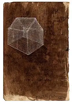 Starting in 2003, Peter Van Gheluwe begins digging into his own history. He studied the life of his father, who died when Van Gheluwe was 20 years old and spent years in a labor camp in Germany during World War II. Some drawings about this theme were shown in the exhibition "Zie tekening" in Lier.[9] He continues researching the horror and dehumanization and undertakes a few study trips to concentration camps in Germany and Poland, leading to many drawings, sketches, photographs and film clips. This search leads to the art book "Hidden View" in 2008, with introductory texts by Volkmar Mühleis and Luc Martens and an exhibition in Galerie Negenpuntnegen in Roeselare.[10][11] Light continues to have a prominent role in these representations of horror.