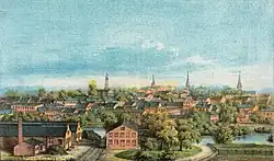 During the Antebellum period Petersburg became the slave states' eleventh largest city, and 49th among all American cities in industrial development.[17] Commission merchants (39 firms by 1860) bought agricultural products from nearby Dinwiddie County as well as points to the north, south and west and sold supplies. Petersburg's industrialists processed cotton, tobacco and metal, then shipped the resulting products out of the region. Richmond and Petersburg became the two largest tobacco towns in the world, with Richmond selling 61% of the state's tobacco in 1861, and Petersburg 23%. Petersburg's cotton industry relied on waterpower since its inception in the 1830s, and by 1860 towns had developed around the Lynch and Callender mills at Ettick and Matoaca and Battersea across the Appomattox river, and the Merchant's Manufacturing Company had another mill at Campbell Bridge near Ettrick. Together those cotton mills constituted approximately a third of that industry in the state. The town also had three water-powered flour mills by 1860, and five iron foundries.[18]