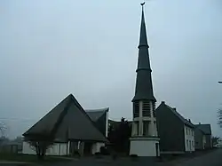 The festive consecration of the new branch church in Löffelscheid, the Church of the Visitation (Maria Heimsuchung) was held on 5 July 1964. The patron is Mary, and a secondary patron is Saint Nicholas. The church is a round building (two cones were set into each other). The architect was Bruno Schönhagen of Koblenz. The high wall stands along with the old retable (Holy Trinity) as emblematic of the Mother of God, the Saints and Christ in the tabernacle. The smaller cone “bears” Salvation – the Eucharist – the altar and the confession chapel. The church's ceiling surrounds one like the protective mantle of the Mother of God. The pews stand in semicircular rows around the altar, which is a simple table made of red sandstone. The bell tower does not directly adjoin the church and has a height of 28 m.