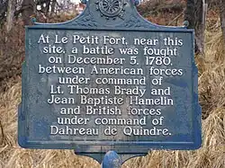 The raiders returned by way of the Sauk Trail with pack-horses loaded down with plunder, mostly trade furs. British Lt. Dagreaux Du Quindre, however, learned of the raid and quickly formed a band of loyalist traders and Potawatomi under Chief Anaquiba and his son, Topinabee.[3] They followed Brady's company and overtook it at the sandy dunes South of Lake Michigan. A race ensued for miles through the dunes, until the raiders took up defensive positions at Petit Fort. Major DePeyster reported the action 8 January 1781 in a letter to General Henry Watson Powell: