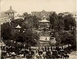 The Petit Serail was planned as a civic center following the Tanzimat reform and according to the Beirut municipality project of 1878. The northern side of Sahet el-Bourj was chosen as a strategic site since it occupied the heart of the new extra-mural city. The new structure was commissioned by Beirut mayor Ibrahim Fakhri Bey, construction began in 1881 at the site of a former saray that was ordered demolished by the Wali Hamdi Pasha.[6][7] The serail was built by Bechara Effendi Avedissian, chief engineer of the Vilayet of Syria and Youssef Effendi Khayat, engineer of the city of Beirut,[3][7] but the project ran into financial difficulties as attested by a number of correspondence letters between the Wali of Syria Ahmad Hamdi Pasha and the Porte. Hamdi Pasha took up a loan form the Ottoman Bank, mortgaged public buildings and imposed new taxes in order to furnish the new serail's offices. In 1883, a park was inaugurated in the square in front of the Serail. The park was called "Hamidie" in honor of the reigning Sultan Abdul Hamid II, but was more commonly known as the Menshieh garden.[8] The Petit Serail was inaugurated three years after the beginning of construction works in 1884.[6][9]