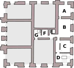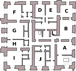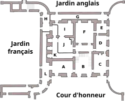 The ground floor, which is only accessible from the south and east sides due to the sloping ground, essentially houses the outbuildings. The terraces make it possible to conceal the passageways needed to service the Petit Trianon and in particular the connections with the ancillary buildings, such as the theatre and chapel.[61] The first floor contains the reception rooms and the Queen's apartments. The King's chambers and the guests' rooms were located in the attic. The 'noble floor' is accessed directly from the porch. Seemingly open onto the gardens, the drawing room floor is located above a ground floor that overlooks, on the Versailles side, the small rectangular cour d'honneur rounded at the corners,[65] redesigned in Marie Antoinette's time, framed by a small wall and a hedge of hornbeams and closed by a soft green gate flanked by two sentry boxes.[66] Opposite is the avenue du Petit Trianon, which leads to the château de Versailles.