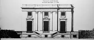 The Neoclassical style is in contrast to the rocaille style of the Pavillon français, built by the same architect in 1750. Inspired by neo-Palladian architecture and possibly by drawings by Jean-François Chalgrin,[56] the building, with its square plan and balustrade, rises over three levels and has a total surface area of 1.458 square metres.[57] Surrounded by gardens, it can be seen from all sides, a form that was to be very popular until the end of the 18th century.[58] Its four comparable façades, however, conceal subtle differences, dictated by the slope of the land, among other reasons. The façade facing west, the French Garden, is the richest: it is adorned with a forecourt of four isolated columns[59] in the Corinthian style surmounted by capitals.[60][note 7] On the south courtyard side, the ground floor is embossed horizontally,[note 8] while the main floor and attic are punctuated with Corinthian pilasters.[61] The north-facing façade has the same composition, but with only the two upper storeys, it opens onto the English garden via two ramps similar to those on the west side. The eastern façade overlooking the former botanical garden has a ground floor entrance, also with horizontal bosses creating a continuous base is devoid of columns or pilasters, the main decoration being intended for the pleasure gardens, to the detriment of the glasshouses and flowerbeds reserved for study.[62] The sculptures adorning the cornices, architraves and window frames are nevertheless identical on all four sides, indicating a certain severity in this return to antiquity.[63] The Italian-style flat roof is concealed by a balustrade.