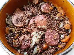 Petit salé is often used as an abbreviation for the recipe 'petit salé aux lentilles' (literally: petit salé with lentils),[3] a dish containing pork, vegetables and lentils.