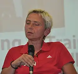In 1981, she played for the then unofficial West Germany national team (SV Bergisch Gladbach 09 was chosen for that purpose) for the unofficial world championship in Taiwan, at a time when no official team nor competition existed.[1] She was a member of the West Germany then Germany women's national football team from 1982 to 1991. She was part of the team at the 1989 European Competition for Women's Football, which won the title for the first time.[2] Each member of the women's team received a tea-set as a prize from the Deutscher Fußball-Bund.[3]