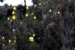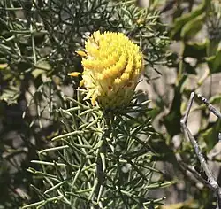 Petrophile drummondii is a shrub that typically grows to a height of 1.0–1.5 m (3 ft 3 in – 4 ft 11 in) and has more or less glabrous young branchlets. The leaves are 20–50 mm (0.79–1.97 in) long on a petiole 10–26 mm (0.39–1.02 in) long and pinnate with rigid, sharply-pointed and needle-like pinnae about 20 mm (0.79 in) long. The flowers are arranged on the ends of branchlets in sessile, more or less spherical heads 30–40 mm (1.2–1.6 in) long, with many glabrous, egg-shaped to lance-shaped involucral bracts at the base. The flowers are about 20 mm (0.79 in) long, fragrant, sticky, yellow and covered with short hairs. Flowering occurs from August to December and the fruit is a nut, fused with others in an oval head 25–30 mm (0.98–1.18 in) long.[2][3]