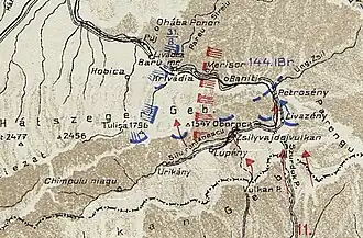 The Romanian forces occupied Petrozsény on 29 August.[4][5][6] The Jiu Covering Force, consisting of the 21st Infantry Brigade of the 11th Division, crossed the border at the Vulkán and Szurdok passes and occupied the vital Transylvanian coal-mining center at Petrozsény on 29 August. The weak resistance put up by the Hungarian coal-miner battalions was easily swept aside by the Romanian units, who inflicted heavy casualties. The rest of the 11th Division (General Ioan Muică) subsequently crossed the mountains and joined the covering forces. It then pushed further west, stopping 15 miles from Hátszeg (Hațeg). Although this halt complied with the instructions received by Culcer, it allowed the Austro-Hungarians time to regroup and would have great repercussions later.[7] By 3 September, this group of General Culcer's Romanian 1st Army occupied the important coal area between Hobicaurikány (Uricani) and Petrozsény, driving back the ineffective Landsturm and miners battalions of the 144th Infantry Brigade over the saddle of Merisor.[8] On 29 August, fighting also took place against the 144th Brigade at Zsilyvajdejvulkán (Vulcan),[9] with further fighting taking place at Mount Oboroca on the 30th.[10] The commander of the 144th Brigade was Colonel Ludwig Berger.[11]