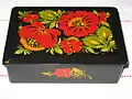 Ornamental painting on walls and on paper were common in many villages of the Dnipropetrovsk area, but were most prevalent and highly developed in the village of Petrykivka, from which the style takes its name.[4] Mural decoration of homes have existed in Petrykivka from at least 1860, and works on paper - from the late nineteenth century.[5] From the time of the Nova Sich in the mid-1700s until the middle of the nineteenth century, these lands were primarily populated by settlers from the Poltava and Sloboda regions, and it is possible that these migrants brought this painting tradition to Petrykivka.[5] No descriptions of wall decoration exist for the Poltava area in the nineteenth century, but there were reports of mural decoration in Sloboda region, such as from 1860 in the Kupiansk area of Kharkiv Oblast.[5] Therefore, it has been proposed that the Petrykivka tradition originated from the Sloboda region.[5] However, there also exist boxes with decorative floral painting from Poltava dating from the second half of the nineteenth century.[6] Yet another alternative hypothesis is that this painting style came from Podillia via Uman. However, murals with floral ornaments appeared there only much later.[4]