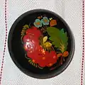 It is believed that Petrivka painting originated from mural decorations of village houses. Painted wall decorations were prevalent in many parts of Ukraine, and different regions had their own characteristic styles.[2] It was traditional for the painting to be restored once or twice each year. In addition to murals, household items made of wood and other materials were also decorated, particularly chests (and especially wedding chests). Later, the tradition of "mal'ovky" (мальовки) arose, in which paintings made in advance by a master on paper could be used to decorate house walls without a painter needing to visit them in person. There are also examples of 18th century religious icons from the Dnipro region that have floral ornamentation which could also be considered an ancestor of the modern Petrikivka style.[3]