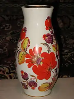Porcelain decoration in the Petrykivka style was developed further in 1944 by the Pavlenko sisters and Vira Klymenko-Zhukov at the Kyiv Experimental Ceramic Art Factory [12] [13]. Marfa Tymchenko also joined that factory in 1953, and her work there was widely recognized.[8][9] Porcelain vases personally decorated by Marfa Tymchenko were given as gifts by Soviet leaders to foreign dignitaries, including Richard Nixon, Mao Zedong, Fidel Castro, and Josip Broz Tito.[10]