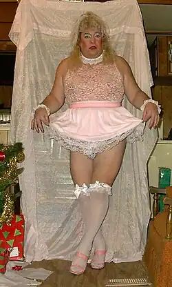 There is some evidence that "petticoat punishment" has occasionally been used as a form of child discipline, with credible stories of such going back at least to Victorian times.[1] "Petticoat punishment", as a sexual fetish interest, involves imagining or reenacting this scenario. However, as a fetish interest, these activities are usually heavily exaggerated and sexualized, including elaborate humiliation and public nudity. They often involve the male being feminized into a sissy by a powerful female presence (often a mother or aunt) in front of his cousins, sisters, or in some cases, girls of his own age whom he had offended by his boorish behavior.