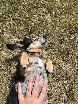 A belly rub or tummy rub is the act of gently touching a dog's stomach area. Numerous dogs enjoy belly rubbing, but not all of them. When a dog rolls on their back, it may be an indication that the dog wants a belly rub; however, this is not always the case. A dog’s stomach is an immensely vulnerable part of their body. Some body language that indicates that a dog wants a belly rub includes vocalization, tail wagging, open (or squinty) eyes, relaxed and open mouth, while their body is wiggly and loose. If the dog kicks their leg or both legs during belly rub, it is completely normal, and the phenomenon itself is called a scratch reflex.[3][4][5]