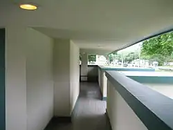 The interior is adorned with a fireplace at the T's crossing point. The cross of the T is an open-air, covered porch. The porch not only incorporates the open terrace common to other Wright designed buildings of the era but also has an explicit functionality. Wright meant for the porch to be used by those attending funerals while they waited for cars.[5] The placement of the columns on the porch, pulled back from the open corners is found on other Wright buildings such as the Coonley House and the Martin House. The column placement and Wright's drawings may have influenced European architects after 1910 such as Le Corbusier.[6] The wood framed building's partial basement contains restrooms, storage, and a furnace room, although the building was originally unheated.