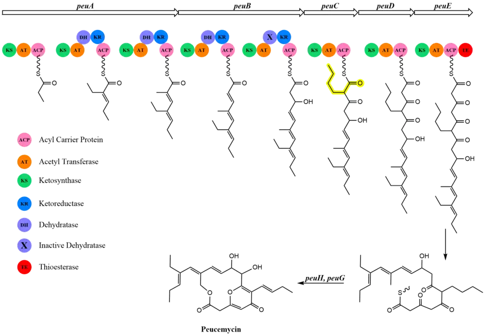 Peucemycin is synthesized through a type 1 polyketide synthase with 8 proposed modules from 5 PKS-related genes (peuA-peuE).[2] The type 1 PKS pathway used for biosynthesis is shown in Figure 1. The first gene, peuA, encodes for an initiation module and two elongation modules. The structure of the ketosynthase enzyme in the initiation module has a mutation of a cysteine residue to a glutamine residue that allows for decarboxylation of the starting material without condensation.[3] The next gene, peuB, encodes for modules 3 and 4. Sequencing data of Module 4 indicates presence of a dehydratase enzyme, but amino acid mutations leave this enzyme inactivated, meaning a singular hydroxyl group at carbon 9 is generated. Module 5 is encoded by peuC, and an additional gene, peuI, is proposed to introduce the butyl malonyl-CoA in this module. Modules 6 and 7 are encoded by peuD and peuE respectively. The forming polyketide chain is hydroxylated with cytochrome P450 enzymes, peuH and peuG, and the terminal thioesterase domain in Module 7 catalyzes the product release and macrocycle formation to form peucemycin.