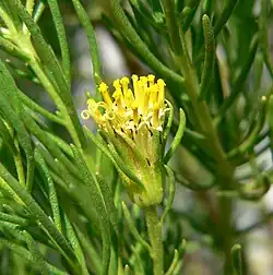 Peucephyllum is a monotypic genus of flowering plants containing the single species Peucephyllum schottii. Its common names include pygmy cedar,[2][4] Schott's pygmy cedar,[1][5] desert fir,[6] and desert pine.[6] It is not a cedar, fir, or pine, but a member of the aster family, Asteraceae. It is a leafy evergreen shrub with glandular, resinous foliage. It flowers in yellow flower heads which have only disc florets. The fruits are woody, bristly seeds with a pappus. This plant is native to the deserts of Arizona, California, Nevada, and Utah in the United States and Baja California and Sonora in northern Mexico.[7][3]