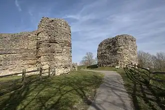 A subsequent rebuilding saw the timber palisades of the inner bailey replaced by stone walls and towers. Exactly when this happened is unclear, but it may have been under Peter of Savoy, the Earl of Richmond, who was granted the castle by Henry III in 1246. There is no record of the rebuilding but in 1254 Peter ended the feudal requirement to maintain the palisades and replaced it with cash payments.[57] This probably reflected the replacement of the palisades with the stone walls and towers visible today. The castle faced a lengthy siege only a decade later during the Second Barons' War from the rebel baron Simon de Montfort, following Henry's defeat in the Battle of Lewes. Defeated members of the royalist army fled to Pevensey, pursued by de Montford's forces, but the garrison refused an invitation to surrender and endured over a year of besiegement. Their adversaries were unable to stop supplies reaching the castle despite digging a ditch to cut it off from the mainland; its garrison raided the surrounding countryside and sought to obtain fresh supplies of men and weapons by sea in December 1264. The costly and ineffective siege was eventually lifted in July 1265. We know the name of at least one of the defenders of the castle from Savoyard archives held in Turin, that of Nantelme de Cholay, a vassal of Peter of Savoy as Seigneur de Faucigny from what is now Choulex near Geneva. We know that Cholay had allies with him since the source quotes also his "sociorum" which we can translate as allies or associates.[58] The siege caused significant damage to the castle, with the Roman wall toppled on the south side. The parish churches at Pevensey and Westham also suffered damage, which the attackers may have caused in using them as siege castles (temporary fortresses and artillery platforms).[59]
