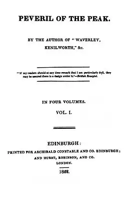 Peveril of the Peak (1823) is the longest novel by Sir Walter Scott. Along with Ivanhoe, Kenilworth, and Woodstock this is one of the English novels in the Waverley novels series, with the main action taking place around 1678 in the Peak District, the Isle of Man, and London, and centring on the Popish Plot.