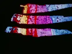 Peyote Queen is the second and best known part of de Hirsch's trilogy, The Color of Ritual, the Color of Thought. It is preceded by Divinations (1964) and Shaman (1966). The film's imagery is abstract, consisting of both live action footage and animated sequences which de Hirsch created by painting and etching directly on the 16mm film stock. Split screens, kaleidoscopic lenses, and abstract animations are used to create a psychedelic effect. De Hirsch had a background in painting (she published an interview of the abstract expressionist painter, Willem de Kooning, in 1955), and her films of this period have been described as "painterly."[1][2] The soundtrack consists of African drumming and singing interspersed with American pop music.