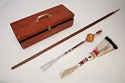 Ceremonies are generally held in a tipi and services must be conducted by a priest, pastor, or elder, known as the Roadman.[10] The Roadman is assisted by a Fireman, who cares for the holy fireplace, ensuring it burns consistently all night. The Roadman may use a prayer staff, a beaded and feathered gourd, a small drum, cedar, and his eagle feather to conduct services. The Roadman's wife or other female relative prepares four sacramental foods and the "second breakfast" that are part of the church services. Her part takes place very early, between 4:30 and 5:00 in the morning. The four sacramental foods are water, shredded beef or "sweet meat," corn mush, and a variety of berries. The sweet foods were added later to counterbalance the bitterness of the peyote consumed during the services. The second breakfast is like a typical American breakfast. It generally includes boiled eggs, toast, hash brown potatoes, coffee, and juice. This meal is served well after sunrise and just prior to the closing of the church services.