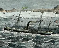 On October 5, 1869, the Pfeiffers boarded the Northern Pacific Transportation Company’s 222 feet (68 m) side wheel passenger steamer Sierra Nevada at the Folsom Street wharf in San Francisco with their livestock and headed 120 miles (190 km) south to Monterey. The ship carried up to 345 passengers.[11] It was struck by a raging storm while at sea, causing waves to break over the deck. When they arrived at Monterey after two days, their mother was so sick she could not walk.[10] The Pfeiffer family was fortunate to get off the ship in Monterey. On the night of October 17, having left Monterey that afternoon, the ship was wrecked in dense fog on a reef 1.6 nautical miles; 1.9 miles (3 km) north of Piedras Blancas. All of the passengers and crew were saved, but the ship and its cargo were a total loss.[12]
