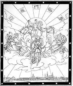 The journal's name is that of the sun-god Phoebus, generally associated with the Greek Apollo. The frontispiece of the first issue, designed by Ferdinand Hartmann, shows Phoebus in a chariot, drawn by sun-horses over the town of Dresden. Kleist wrote: "Thunder on, O thou, with thy flaming steeds, / Phoebus, bringer of day, into infinite space!"