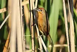 The orange-breated thornbird is monotypic.[2] However, was previously treated as a subspecies of what is now the orange-eyed thornbird (P. erythrophthalmus) under the common name red-eyed thornbird. In addition to differences in eye and plumage color, the two taxa have different voices and are locally sympatric in São Paulo state without evidence of interbreeding.[4] For a while after the two were split, some taxonomic systems continued to use "red-eyed" for P. erythrophthalmus and others used it for P. ferrugineigula. The current "orange-eyed" and "orange-breasted" English names were adopted to avoid confusion with the former "red-eyed".[5]