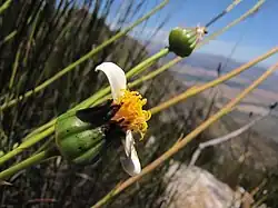 The flower heads each have five to eight female ray florets that consist of a closed tube at base and a strap nearer the top. The tube is cylinder-shaped and has a few to many blunt hairs, which are several rows of cells thick and are topped with glands. The straps are white or cream-coloured, elliptic or obtuse in shape, mostly have four veins and is split in three teeth at the tip. From the mouth of the ray floret tube emerges a style that splits in two outward curling, hairless branches each topped by an obtuse conical appendage. Surrounding the base of the ray floret corolla are many, white, barbed pappus bristles which are quickly shed in the ray florets. At the base of the ray floret develop eventually dark brown to black, dry, one-seeded, indehiscent fruits called cypselae, which are oblong in shape, and have five or six wing-like, hairless ridges along their lengths.[2]