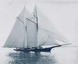 On May 12, 1879, Osgood sold the Phantom to Henry S. Hovey of Boston. He moved her to the Eastern Yacht Club located in Marblehead, Massachusetts.[14] Hovey sailed her for the next five years, where he took her on a number of trips to New York for races there and at New Bedford. In 1881, the Phantom was one of the yachts which took part in the Yorktown celebration.[15] In 1882, Hovey had the keel schooner-rigged yacht Fortuna built by C. & R. Poillon of Brooklyn, New York from a design by A. Cary Smith.[16]
