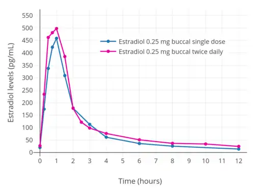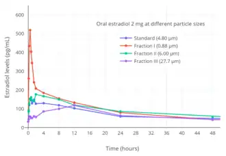 A study compared different particle sizes of oral micronized estradiol.[38][58][59] A preparation with the smallest particles (mainly <0.6 μm) was found to have the most rapid absorption and the highest bioavailability.[38][59] However, a sharp peak in estradiol levels, without an accompanying rise in estrone levels, was observed during the first 2 hours with this particle size.[38][59] It was suggested that the smallest estradiol particles may have been absorbed by the lymphatic system, partially bypassing first-pass metabolism and resulting in very high initial estradiol levels.[38] The preparations with the larger particle sizes (mainly <3.5 μm and <20 μm) were found to be absorbed more slowly, without a pronounced initial peak in estradiol levels.[38][59] Levels of estradiol were more even and similar to physiological levels with these particle sizes.[38][59] Differences in area-under-the-curve estradiol levels with the different particle sizes were relatively small.[38] As such, micronization may improve absorption but does not necessarily improve therapeutic effect.[59]