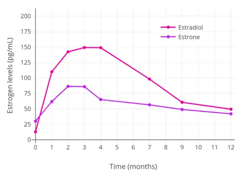 Different estradiol routes and dosages can achieve widely varying circulating estradiol levels (see the table below).[10] For purposes of comparison with normal physiological circumstances, menstrual cycle circulating levels of estradiol in premenopausal women are 40 pg/mL in the early follicular phase, 250 pg/mL at the middle of the cycle, and 100 pg/mL during the mid-luteal phase.[15] Mean integrated levels of circulating estradiol in premenopausal women across the whole menstrual cycle are in the range of 80 to 150 pg/mL, according to some sources.[16][17][18] In postmenopausal women, circulating levels of estradiol are below 15 pg/mL.[10][15] During normal human pregnancy, estrogen production increases progressively and extremely high estrogen levels are attained.[19] Estradiol levels range from 1,000 to 40,000 pg/mL across pregnancy,[20] are on average 25,000 pg/mL at term, and reach levels as high as 75,000 pg/mL in some women.[21]