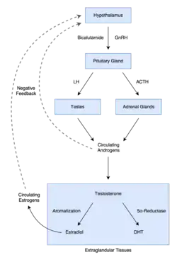 In men, blockade of the AR by bicalutamide in the pituitary gland and hypothalamus prevents the negative feedback of androgens on the hypothalamic–pituitary–gonadal (HPG) axis, resulting in an increase in luteinizing hormone (LH) secretion and levels.[86] Follicle-stimulating hormone (FSH) levels, in contrast, remain essentially unchanged.[87] The increase in LH levels leads to an elevation in androgen and estrogen levels.[88] At a dosage of 150 mg/day, bicalutamide has been found to increase testosterone levels by about 1.5- to 2-fold (59–97% increase) and estradiol levels by about 1.5- to 2.5-fold (65–146% increase).[64][76][83] However, there is variability in these increases, and in one clinical trial, the highest testosterone concentration that occurred with 50 mg/day bicalutamide monotherapy was 2,306 ng/dL, which was five times the normal average level of testosterone in men.[42][89] Levels of DHT are also increased to a lesser extent (by 24–30%), and concentrations of sex hormone-binding globulin (SHBG) and prolactin increase as well (by 8–42% and 40–65%, respectively) secondary to the increase in estradiol levels.[83][90][91] The estradiol concentrations produced in men by bicalutamide monotherapy are said to approximate the low-normal estradiol levels of a premenopausal woman,[76] while testosterone levels generally remain in the high end of the normal male range and rarely exceed it.[92][32] Dosages of bicalutamide of 10 mg, 30 mg, and 50 mg per day have been found to produce a "moderate" effect on sex hormone levels in men with prostate cancer (notably providing indication that the drug has clinically-relevant antiandrogen effects in males at a dosage as low as 10 mg/day).[93][85] The elevated levels of gonadotropins and gonadal steroids associated with NSAA monotherapy is a unique endocrine state which can be described as "hypergonadotropic hypergonadism".[94][95]
