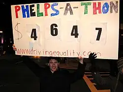 Phelps-A-Thon.com assists groups that are being picketed by WBC in setting up a Telethon type of counter-protest. Through the "Phelps-A-Thon.com" website, supporters can pledge online to donate a certain amount of money for every minute of WBC pickets against a specific target, usually LGBT or Jewish groups.[5] The longer they protest, the more money they raise for the cause that they are demonstrating against.[6][7][8]