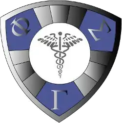 Phi Sigma Gamma's motto is Mens et Manus. Its badge is triangular with two bevels.[2] Its raised center features a spinal cord section in white enamel. The second bevel is black and includes the Greek letters Φ, Σ, and Γ in the corners.[2] The fraternity's colors are blue and black.[2] Its flower is the white carnation.[2] It annual publication is The Speculum.[2]