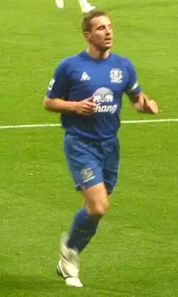 Jagielka eventually signed for Everton on 4 July 2007, in a deal worth £4 million on a five-year contract,[29] the highest amount paid for a Sheffield United player at the time.[30] He made his home debut at Goodison Park on 31 July 2007 as a second-half substitute in a pre-season friendly against Werder Bremen, replacing Joseph Yobo in central defence. After a slow start to his Everton career, Jagielka developed into an important member of the first team. He scored his first Everton goal in the UEFA Cup against AZ.[31] He scored an own goal against Wigan Athletic, although Everton won 2–1. He put in a succession of man of the match performances in the following matches, against Tottenham Hotspur, Brann and Manchester City. He scored his first league goal for Everton against Reading on 9 February 2008.[32]