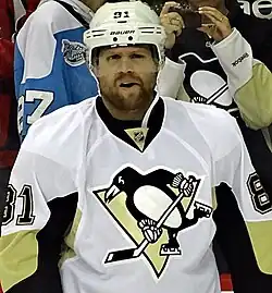 After weeks of trade rumors, on July 1, 2015, the Maple Leafs, who were entering a rebuilding phase, traded Kessel, Tyler Biggs, Tim Erixon, and a conditional second round draft pick to the Pittsburgh Penguins in a blockbuster deal for Kasperi Kapanen, Scott Harrington, Nick Spaling, and conditional first- (Sam Steel) and third-round (James Greenway) draft picks. Toronto also retained $1.2 million of Kessel's salary for the remaining seven seasons of his contract.[21] Kessel scored his first regular season goal as a Penguin on October 10, while playing against the Arizona Coyotes in the team's second game of the 2015–16 season on October 10, 2015.[37] On December 19, 2015, Kessel played his 500th consecutive game, becoming the 23rd player in league history to reach this milestone. On June 12, 2016, Kessel won the Stanley Cup after the Penguins defeated the San Jose Sharks in six games. Kessel played on a line with Nick Bonino and Carl Hagelin that was the most effective line for the Penguins in the playoffs (called the HBK line). Kessel led the Penguins in playoff scoring with 10 goals and 22 points and also led the team in shots with 98.[38][39] Kessel narrowly missed winning the Conn Smythe Trophy as the playoff MVP, falling short of teammate and captain Sidney Crosby by three points. In the 5–3–1 point distribution scheme based on the ballots of 18 voters, Crosby had nine first-place votes, five second-place votes, and three third-place votes, while Kessel had seven first-place votes, eight second-place votes, and one third-place vote.[39] As a member of the 2015–16 Stanley Cup winning team, Kessel was entitled to spend a day with the Stanley Cup. For his day with the cup, Kessel initially brought the cup to his hometown of Madison, Wisconsin, where he celebrated with family and friends.[40] He then returned to Toronto, bringing the trophy to SickKids Hospital to share it with patients and their families.[41]