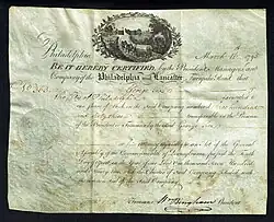 Share of the "Company of the Lancaster and Turnpike Road", issued 16 March 1795