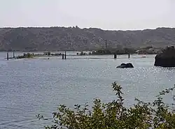 Until 1974, the ruins of temples and an ancient Egyptian city were located here. They were damaged by several decades of seasonal submergence in the lake held back by the old Aswan Dam.[2][3] With the commissioning of the Aswan High Dam in 1970, there was a threat of permanent flooding of the area.[4] In anticipation of that, between 1974 and 1976 a cofferdam was built around the temples to facilitate their relocation and rebuilding on the neighboring island of Agilkia. After the operation, only the highest point of the ancient island of Philae and the remains of the cofferdam emerge from the lake.