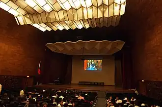 The Philam Life Theater is a proscenium theatre with a seating capacity of 780. It has a rectangular floor area in front of the stage with curved walls and a large concealed cavity above the ceiling where elegant glass light panels hang.[6] Its walls were adorned by narra relief carvings which encompassed the entire length of the theater's orchestra. The 1,536-meter (5,039 ft) multi-panel carved narra murals depicting Philippine folklore, traditional musical instruments, and mythical characters like Maria Makiling and Malakas at Maganda was designed by Filipino sculptor José Alcántara in 1961 and created with the help of local artists from Paete, Laguna.[6] They are now housed at the National Museum of Fine Arts following the closure of the Philam Life complex for redevelopment.[7] [8]