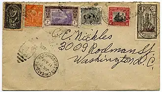 A 1925 philatelic cover, produced by adding common foreign stamps to a usage of a United States 2-cent of the "Norse-American issue". The postal clerk should have rejected this cover, but instead the foreign stamps received US postmarks. From left to right, the stamps are from Austria, Germany, Ivory Coast, French Guiana, United States, and French India.