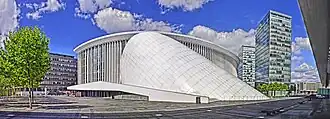 The Philharmonie Luxembourg, also known officially as the Grande-Duchesse Joséphine-Charlotte Concert Hall (French: Salle de concerts grande-duchesse Joséphine-Charlotte, German: Konzertsaal Großherzogin Joséphine-Charlotte), is a concert hall located in the European district in the Luxembourg City quarter of Kirchberg. Opened in 2005, it now plays host to 400 performances each year.